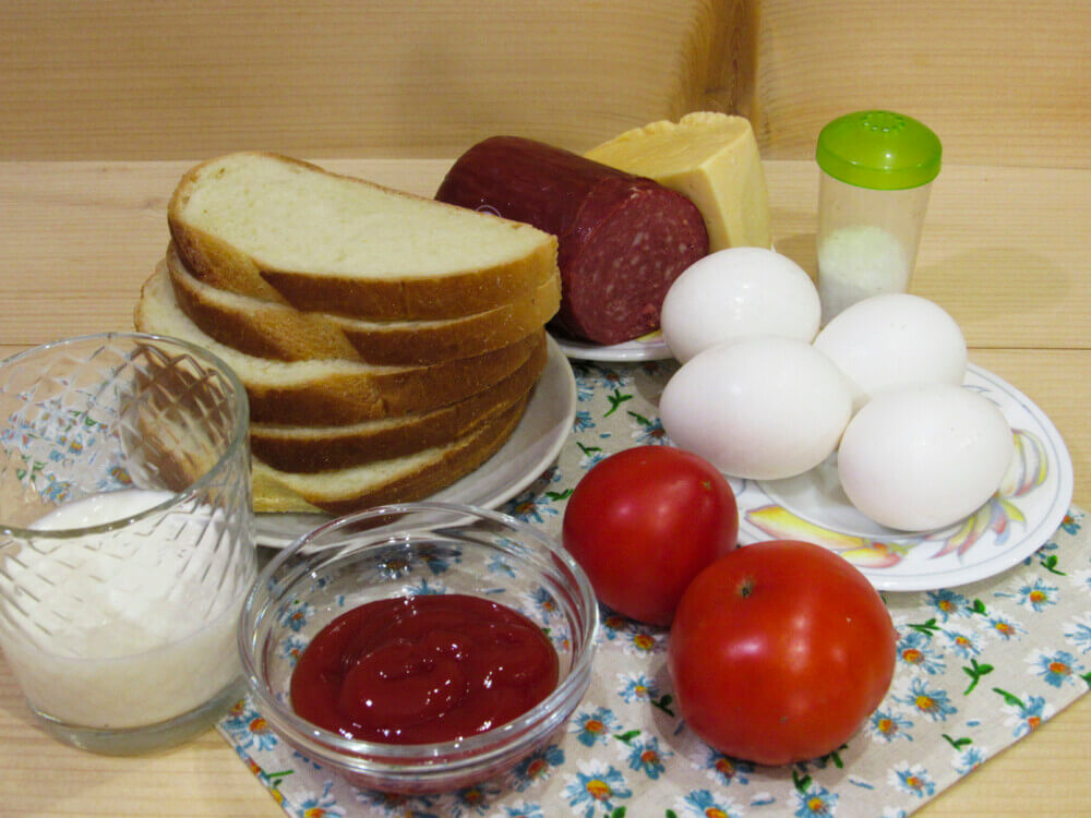 Подготовить все продукты по списку. Нарезать батон ломтиками.