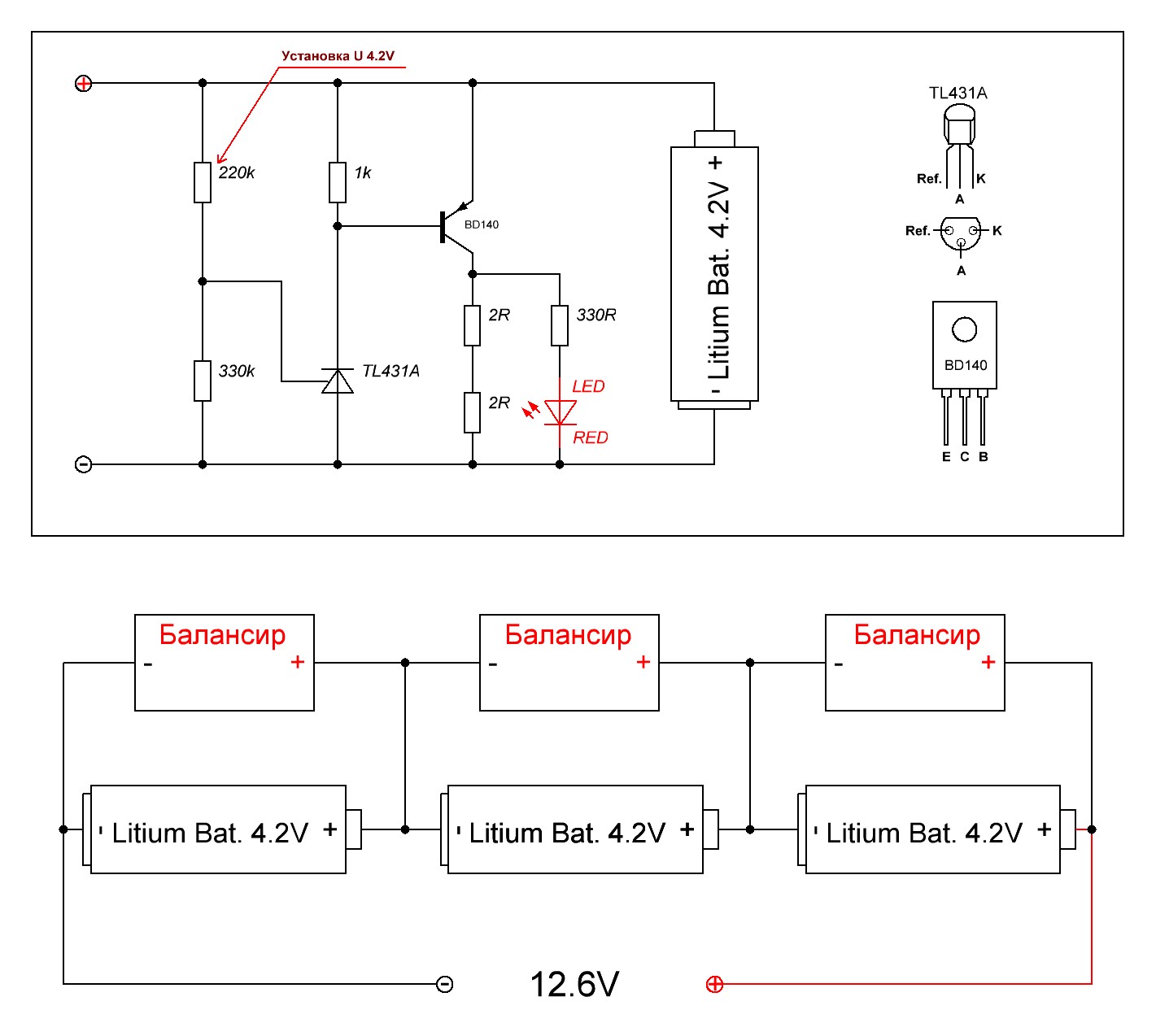 Балансир представляет схему, которая создает препятствия для прохождения тока в заряженную батарею, направляя ее через дополнительные сопротивления, резисторы. Балансир включает стабилитрон TL431A и транзистор односторонней прямой проводимости BDI 40
