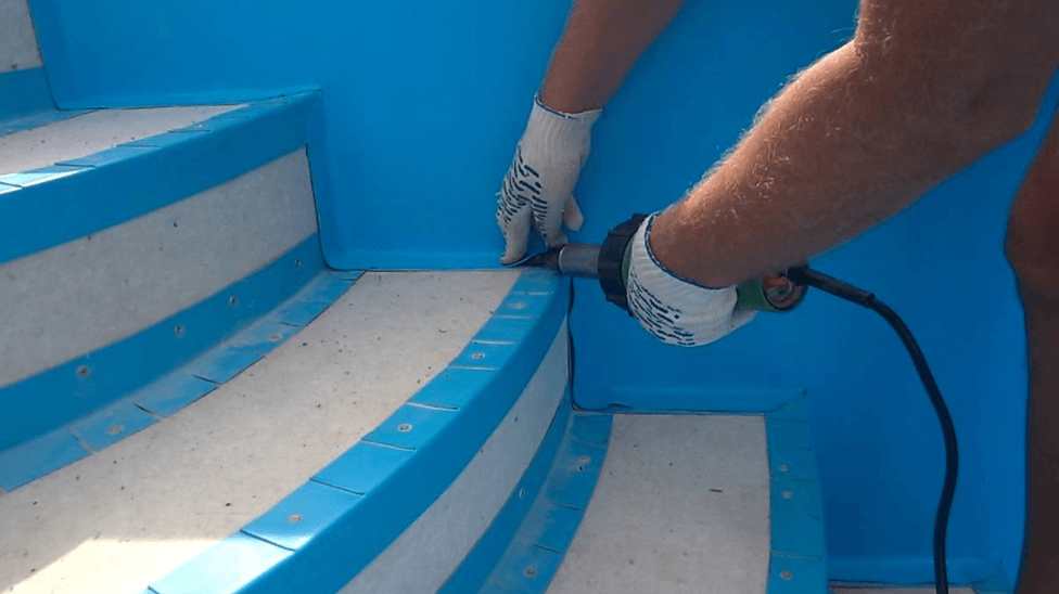 - На последнем этапе ПВХ пленку надо соединить с монтажным профилем на бортике бассейна.