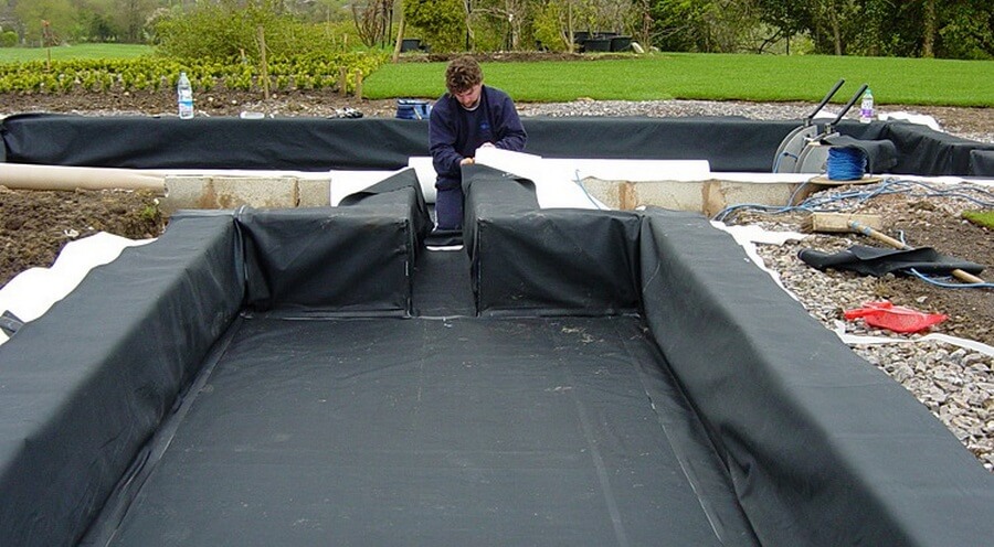 Обычно отделка начинается с монтажа подложного покрытия, крепежной полосы. Почему подложный материал так важен? Он будет защищать пленку от касания с поверхностью искусственного водоёма.