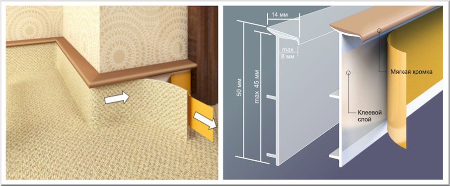 Под ковролин выпускаются специальные плинтусы с клеевым слоем