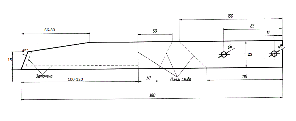 После того как заготовка полностью остыла, уже можно сделать плоскорез своими руками. Отрезав болгаркой нужную длину, можно приступить к следующему этапу – разметке согласно чертежу (где сверлить отверстия, где сгибать).