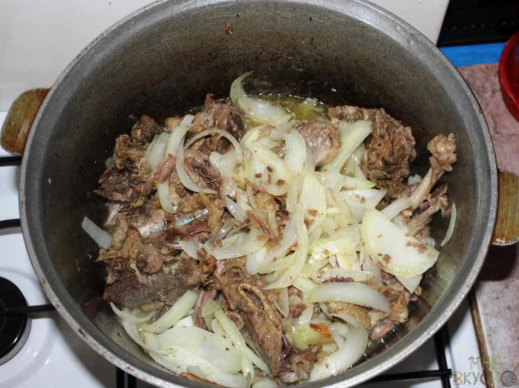Сначала обжаривается лук, лишь потом к нему добавляется баранина, нарезанная крупными кусками