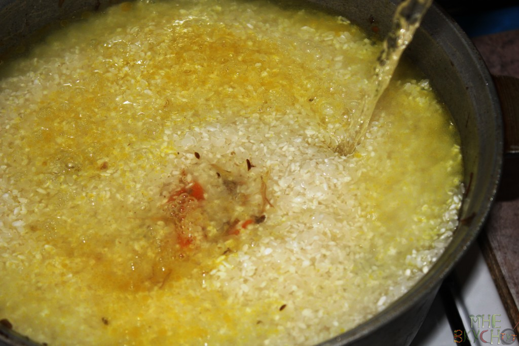 - Для тушения в зирвак вливаем холодную воду, а в рис – горячую.