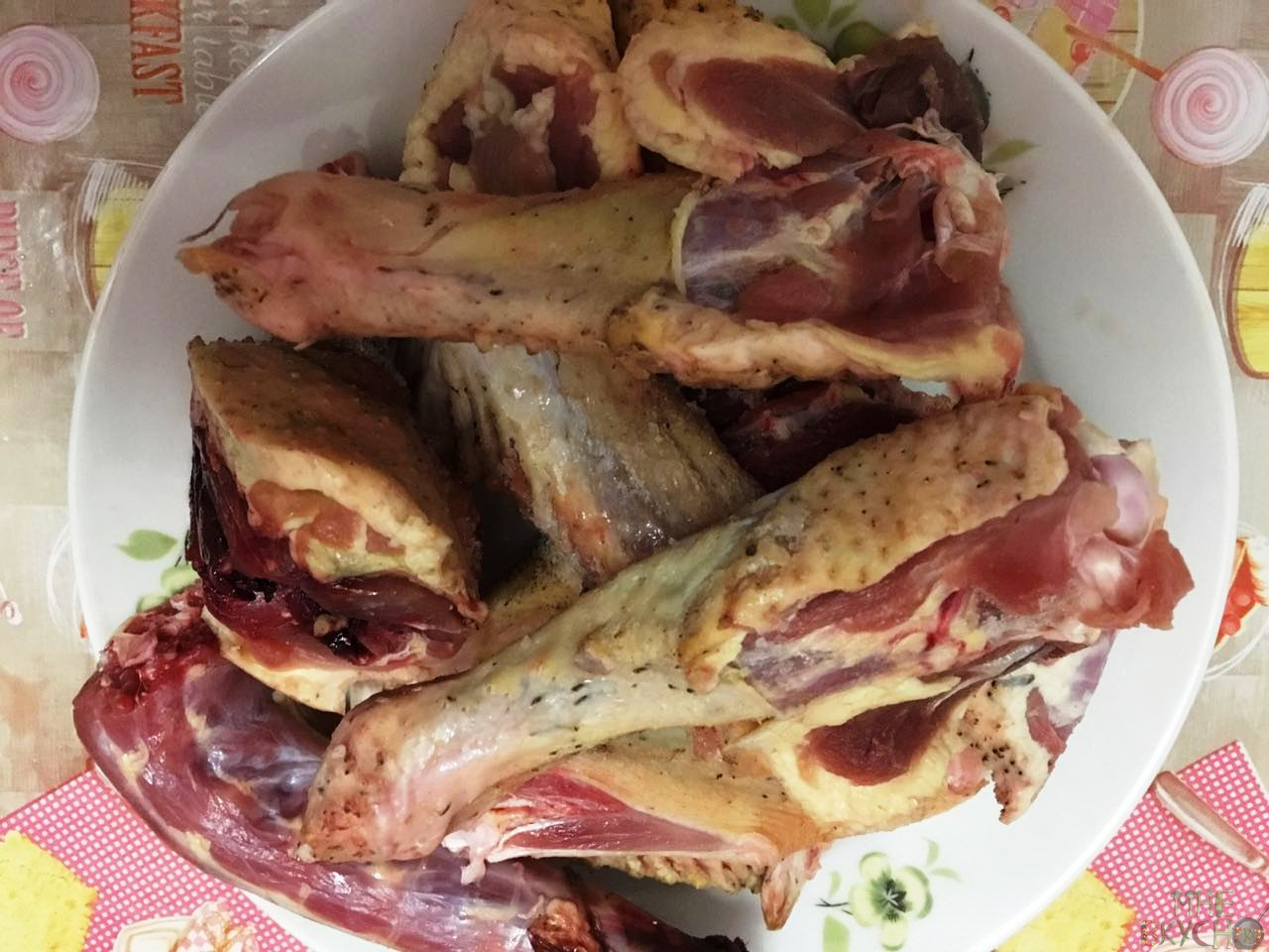 Тушку утки разделываем на части: голяшки, крылья, шея и прочие части. Только прошу: не выкидывайте гузку; на ней много сала и при жарке даст много жира.
