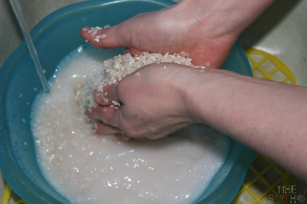 Стараемся промыть рис очень тщательно. Перетираем его между руками, избавляемся от налета.