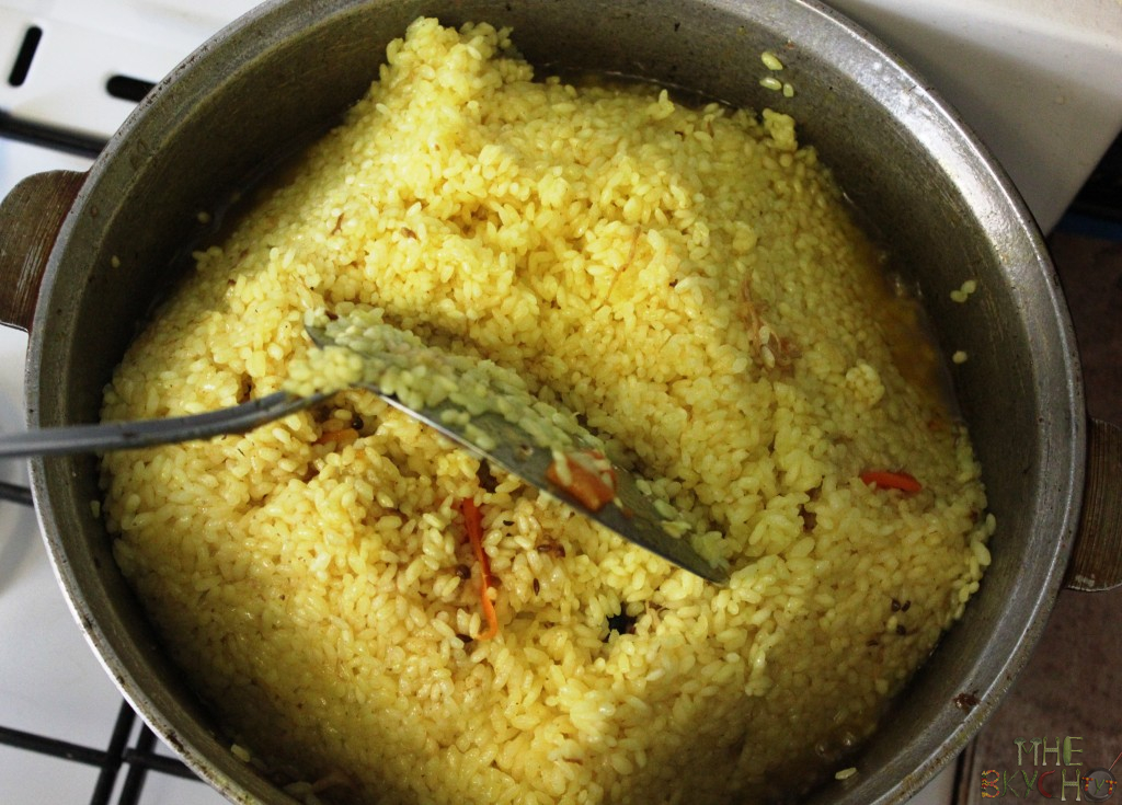 Чтобы рис был рассыпчатым в конце его нужно шумовкой сгрудить ближе к центру и настаивать в тепле до полной готовности.