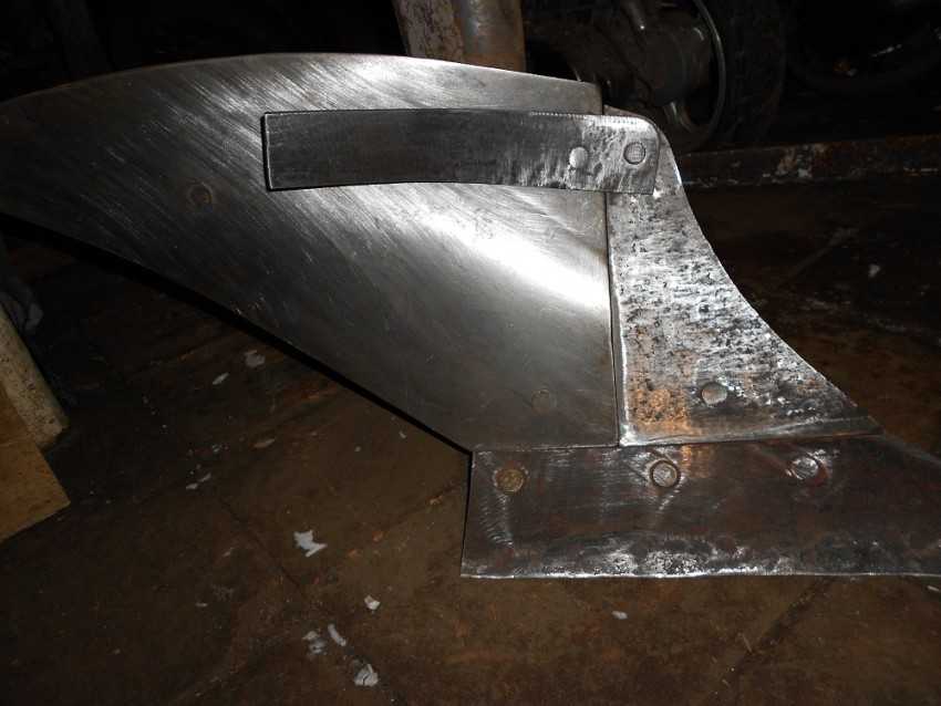 Такая работа требует особой аккуратности, поскольку части будущего сельхозинвентаря должны быть хорошо пригнаны, а углы — совпадать. Боковой щиток, обеспечивающий стабильность и надежность сборки, соединяется с другими элементами точечной сваркой. Если замечено несоответствие в геометрической конфигурации, то форма отвала легко поправляется с помощью молотка.