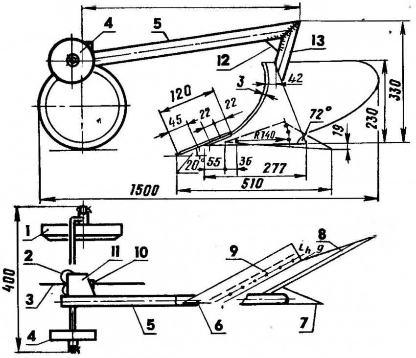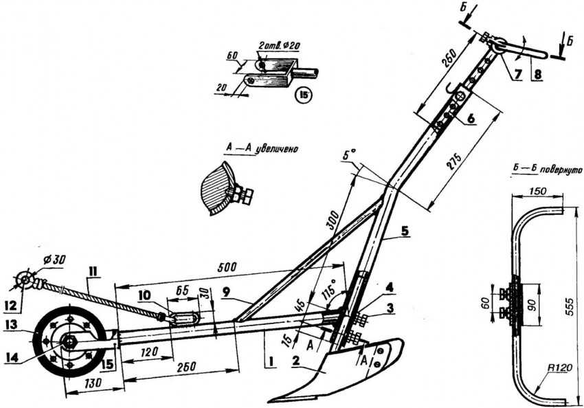 Огородный самодельный плуг для минитрактора или мотоблока: 1 — ручка-рукоятка из трубы, 2 шт; 2 — рама-грядиль; 3 — фиксация стойки винтом М 10; 4 — плуг; 5- крепежная вилка шарнира к раме; 6- дышло из трубы; 7 — колесо; 8 — ступица-подшипник из капронового материала; 9 — рукояток из трубы; 10 — шарнирная ось из болта М 10; 11 — контргайка; 12 — колесная ось; 13 — дистанционная капроновая шайба; 14 — ручка для дышла; 15 -тройник.