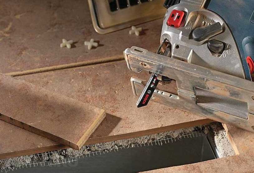 При работе с такими материалами инструмент ни в коем случае нельзя толкать. Для керамики подойдут полотна из твердых сплавов определенной длины, для керамогранита используют алмазные полотна.