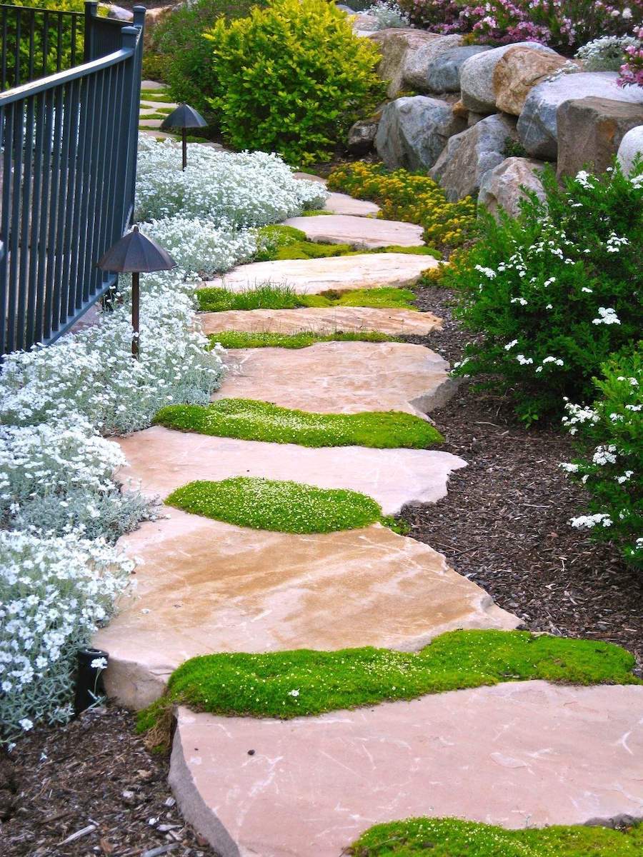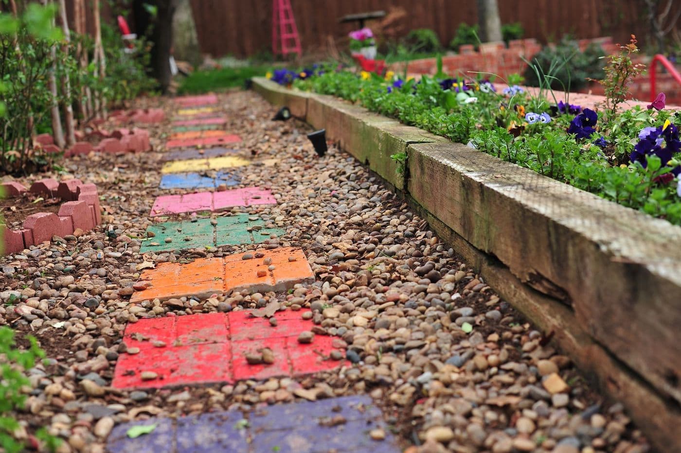 Разукрасив бетонную плитку и уложив ее на землю, можно получить оригинальную садовую дорожку