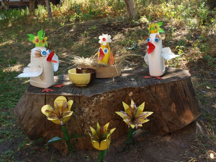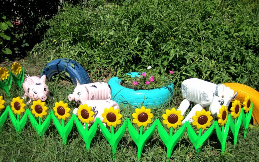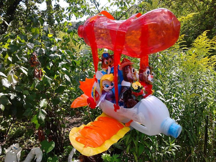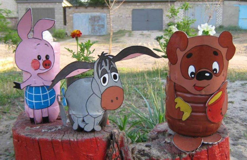 Великолепно смотрятся в саду яркие осы из пластиковых контейнеров, веселые лягушата и поросята. Из простого и доступного материала несложно сделать любого сказочного героя.