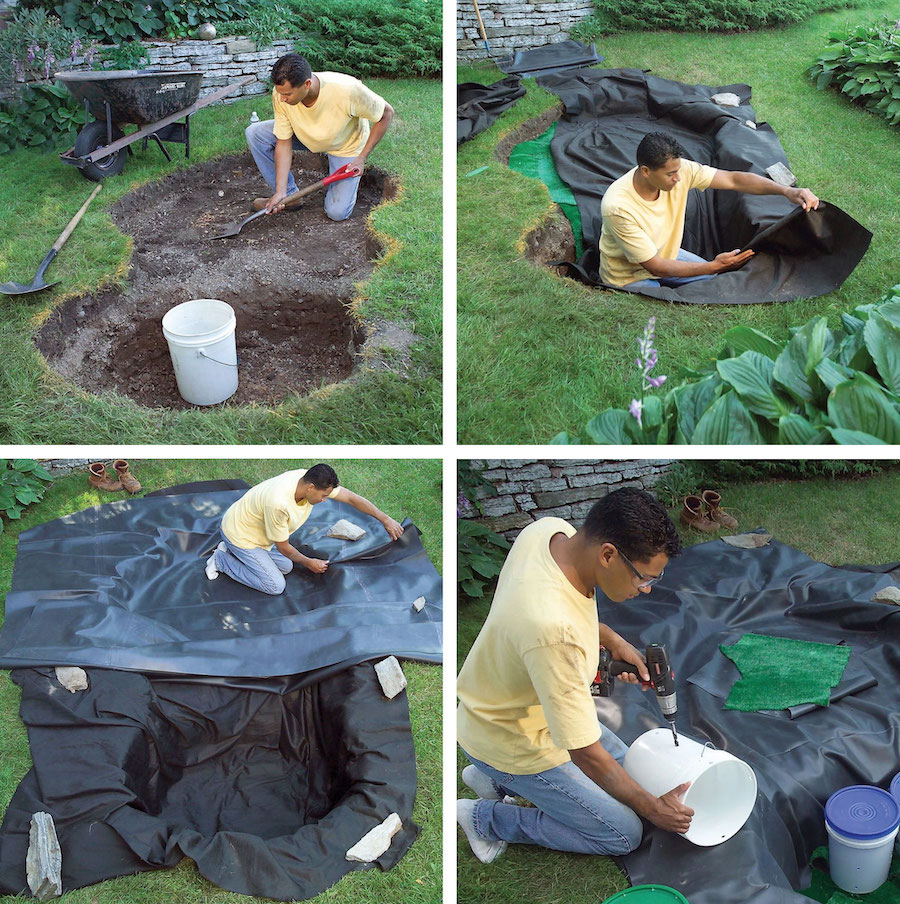 Быстро удается обустроить на участке водоем, если использовать поливинилхлоридную или полипропиленовую плотную пленку. Расстилают ее в выкопанный котлован с выровненными боками и дном.