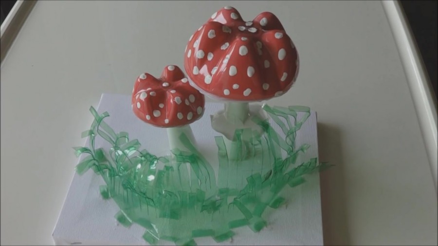 - Из оставшейся длинной части бутылки скручиваем ножку для грибочка и вставляем в проделанное отверстие.