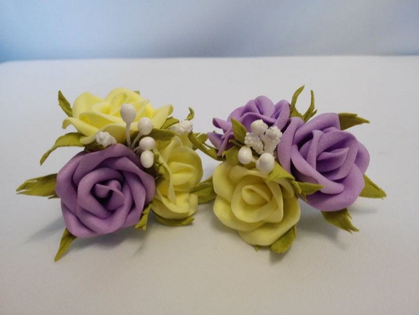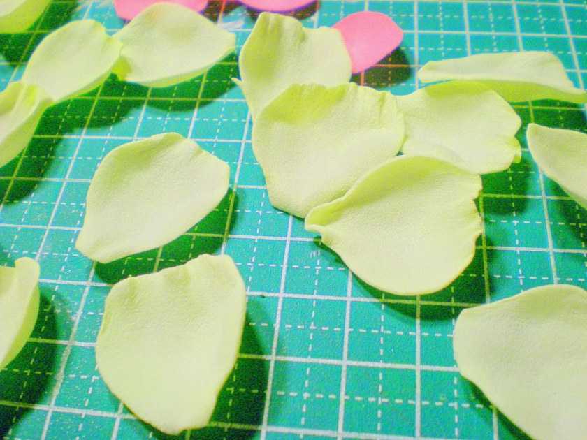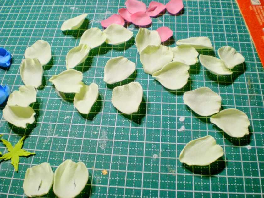 - Цветы собираются по ранее описанной технологии: вырезаются заготовки из фоамирана, разогреваются и формуются.