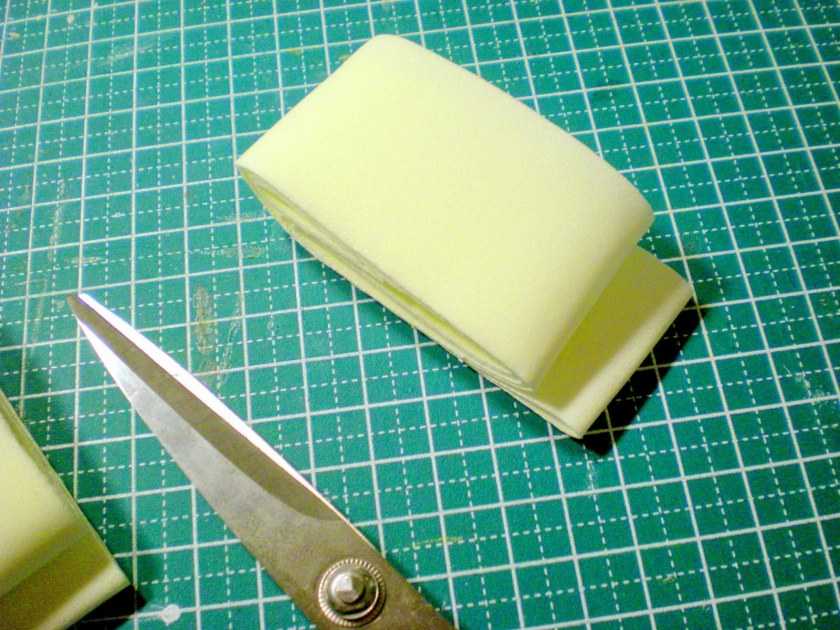 3. Теперь подготовим сердцевину нашего будущего цветка. Для этого из фоамирана вырезаем небольшой прямоугольник. Длина такой заготовки будет 6 см., а вот ширина всего 3 см. Теперь сложите материал ровно посередине, и закрепите его в таком положении при помощи клея.