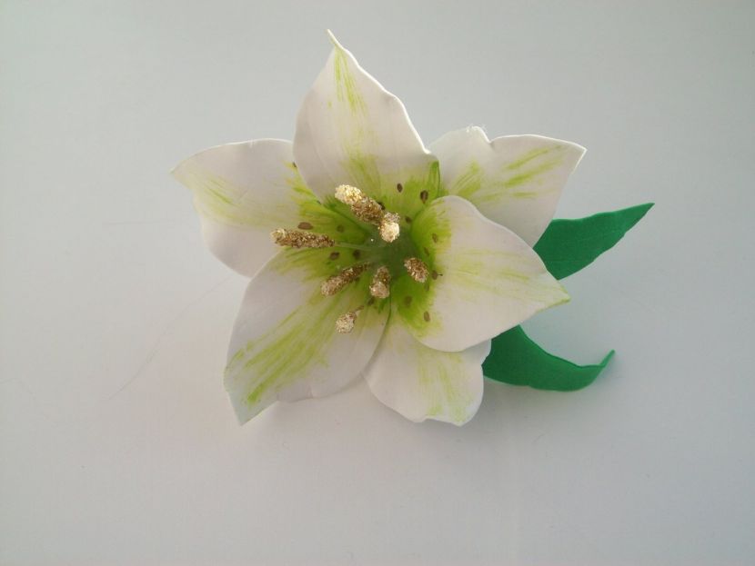 - Готовая поделка в виде лилий может использоваться как украшение заколки или брошки, а можно надеть цветки на проволоку и создать букет, как из настоящих цветов.