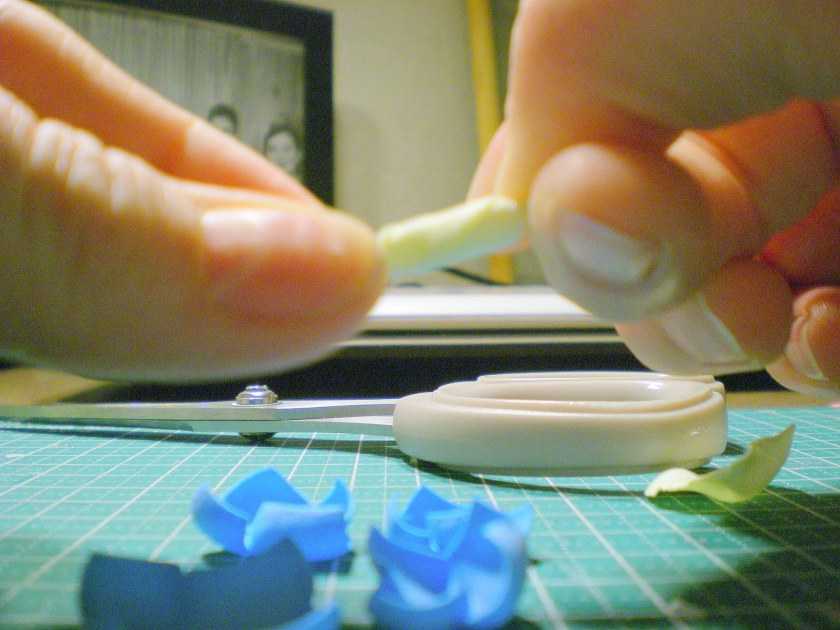 - Вырежьте заготовки в виде вытянутых лепестков, нагрейте их утюгом и придайте аккуратную цветочную форму, продавливая по центру прожилки с помощью деревянной палочки или зубочистки.