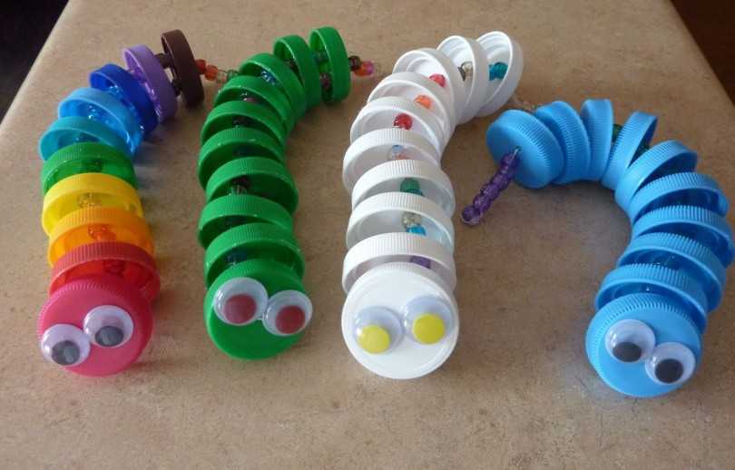 Из пластиковых пробок можно сделать маленькие игрушки. Для этого рисуется эскиз и, следуя нему, крышки склеиваются между собой с помощью супер клея. Одной из наиболее простых вариантов игрушки является гремучая змея.
