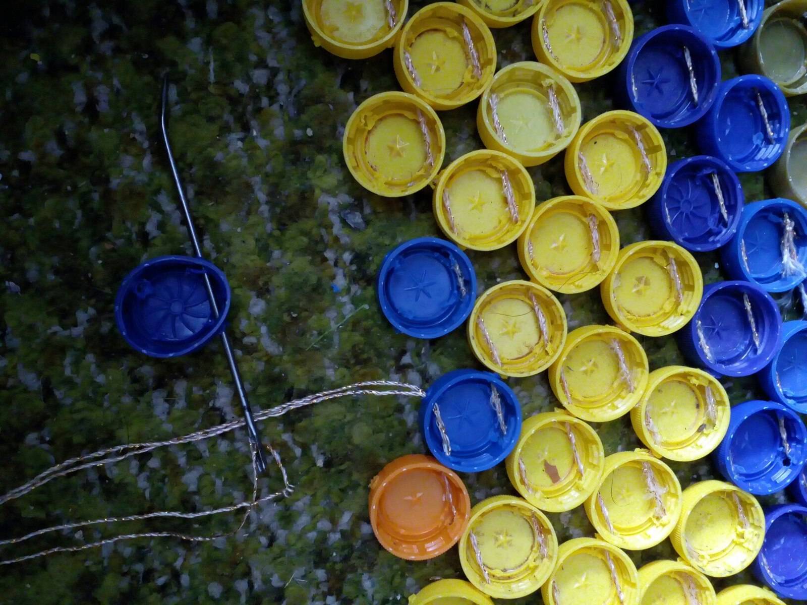 Шаг 4. Начните нанизывать крышки на шпагат парами и открытой стороной друг к другу (см. фото ниже) начиная с пар из крупных крышек и заканчивая парами из маленьких крышек. Наконец, когда все пары колпачков будут нанизаны, сделайте мордочку змеи – наденьте самый маленький колпачок на начало заготовки (то есть на первую пару больших крышек)