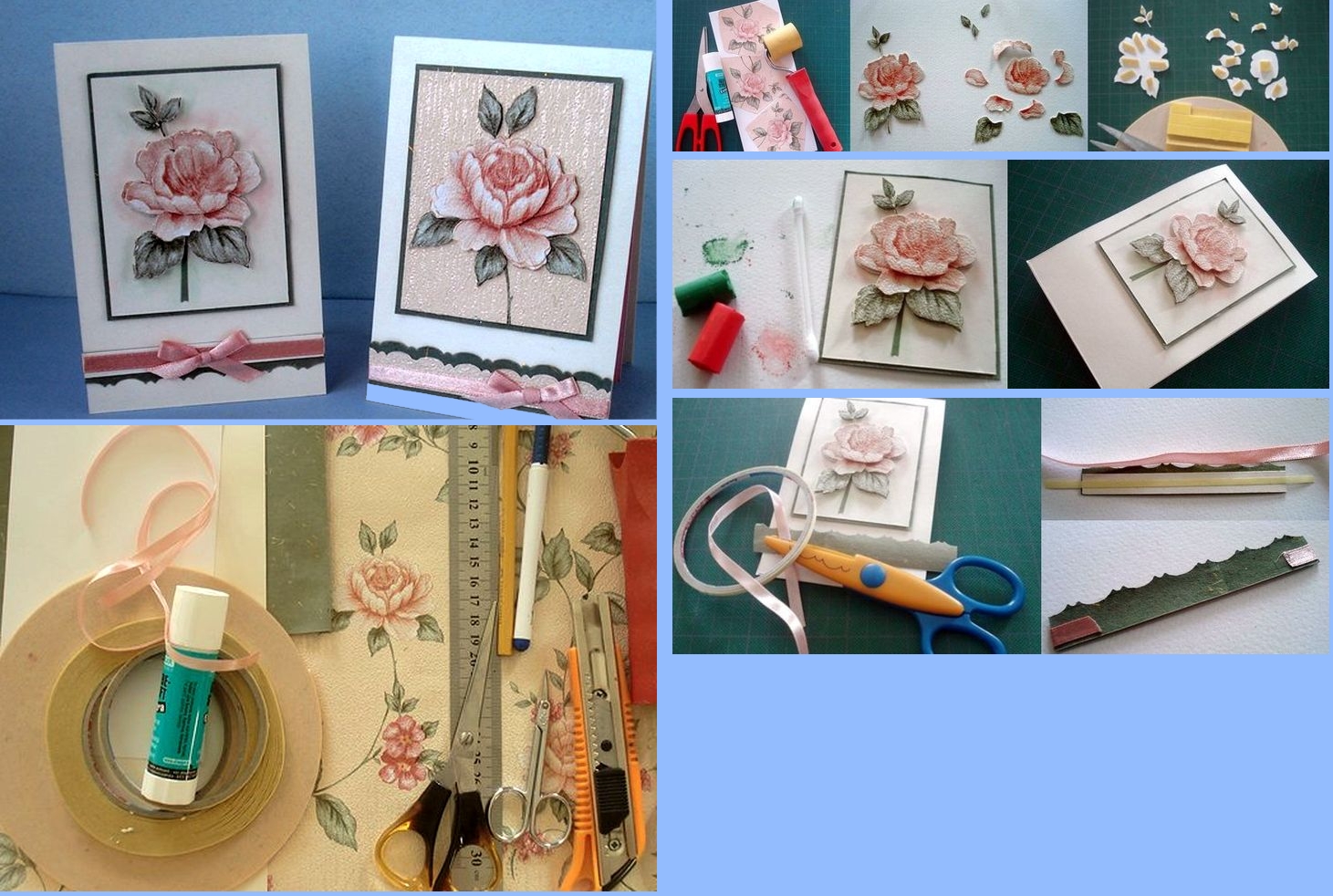 Нижнюю часть открытки можно оформить любым способом. Приклеить полосы цветной фигурно вырезанной бумаги и ленту, подходящие по цвету к основному цветочному мотиву.
