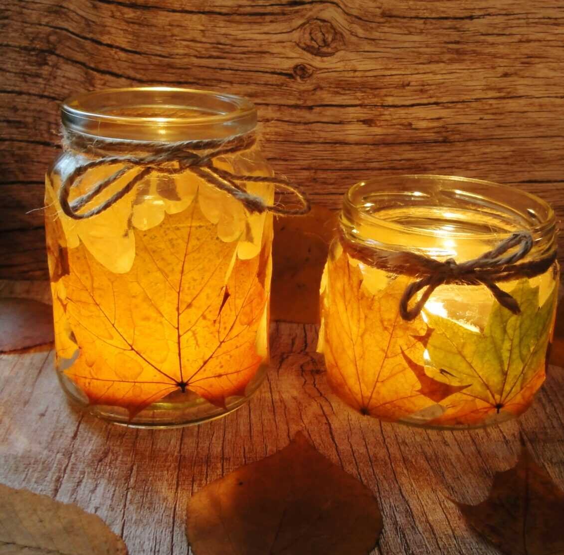Обычно банки-подсвечники украшают с помощью витражных красок. Но если возможности самостоятельно выполнить роспись нет, то можно просто наклеить на банку стеклянную мозаику. Это решение выглядит стильно и интересно. Однако, если данный дизайн кажется слишком смелым, то можно просто украсить банку однотонным или цветным бисером.