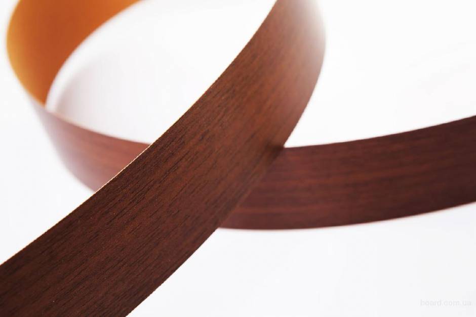 Шпон — тонкий срез древесины, окрашенный и сформованный в виде ленты. Эта мебельная кромка используется на производстве при оклеивании срезов шпонированных изделий. Работа с этим материалом требует определенных навыков, да и материал дорогой.