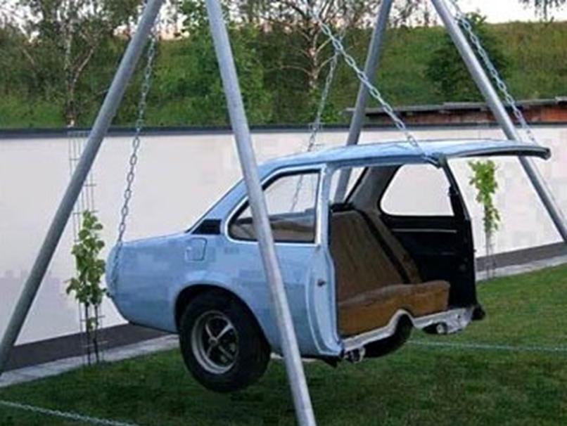 Самые необычные качели во дворе можно сделать самостоятельно, если дать волю фантазии. Найти ненужный автомобиль и разрезать его болгаркой отнюдь не сложно.