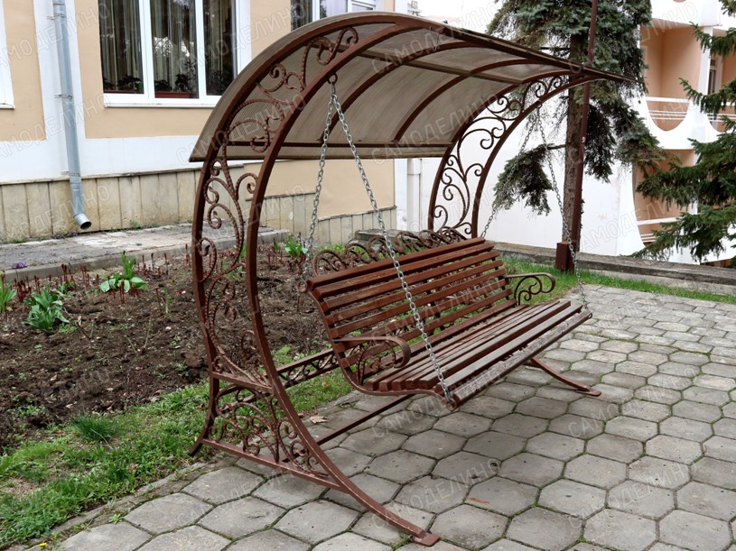 Такое исполнение качелей больше нравится взрослым. Приятные покачивания не захватывают дух и гарантируют отсутствие травм. Крыша из поликарбоната позволяет наслаждаться свежим воздухом и в дождь, и в солнечную погоду. Металлическая вязь украсит ландшафт любого частного надела. Если постараться, то этот вариант под силу повторить своими руками.