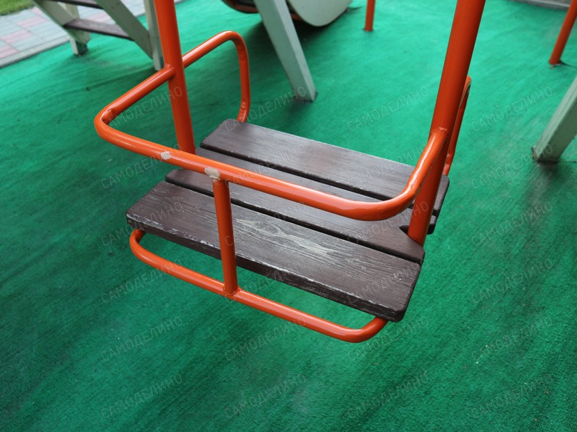 Сверху на перекладине устанавливаются подшипники. К ним с обеих сторон привариваются небольшие куски металла, чтобы предотвратить смещение подшипников по горизонтали. К подшипникам крепятся цепи или тросы. А на них уже вешается сидение. Сидение может быть как деревянным, так и металлическим, со спинкой, подлокотниками или без них. Довольно популярный вариант сидения – в виде скамейки. Главное, чтобы опора и узлы крепления выдержали вес сидения и качающихся на конструкции людей.
