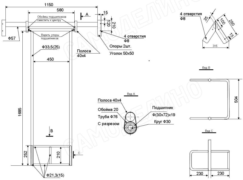 Опоры для несущей трубы я изготовил из уголка 50х50 в соответствии с чертежом и приварил к ее торцам. Сварка остальных деталей – по чертежу.