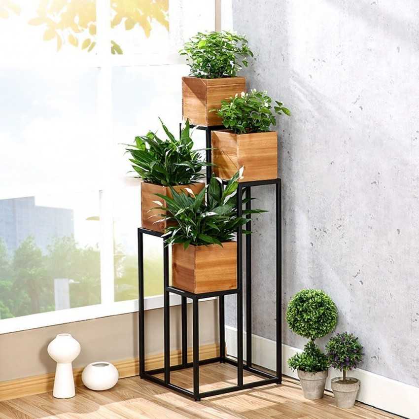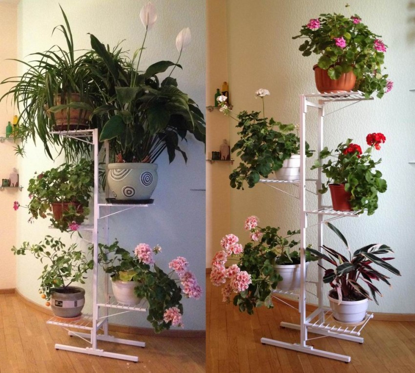В виде террасы или стойки-лестницы. Несколько этажей (от двух до четырех ступеней) такой цветочницы позволяют сделать красивую композицию из растений. Часто применяют эту подставку в углу комнаты.