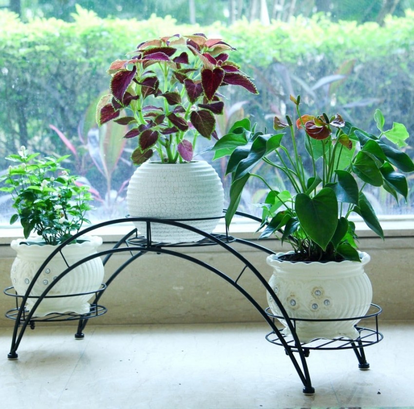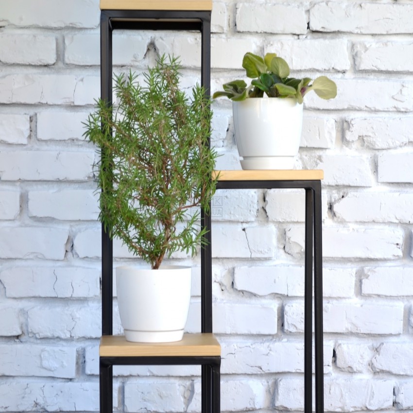 металлические. Изделия из металла, как и кованные, смастерить самостоятельно весьма непросто, за исключением комбинированных (металл/дерево) подставок, где на металлических трубах с сечением 25 мм будут располагаться деревянные горшочки. Если же вам нужно подставки из металла, то придется приобретать готовые изделия;