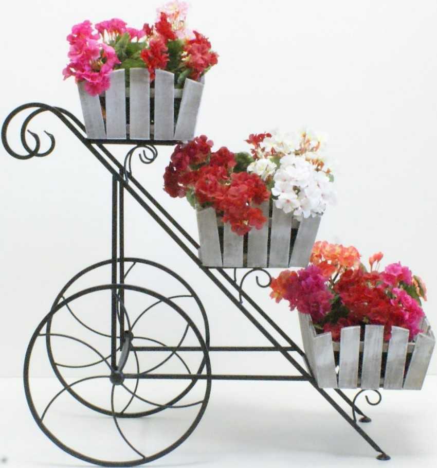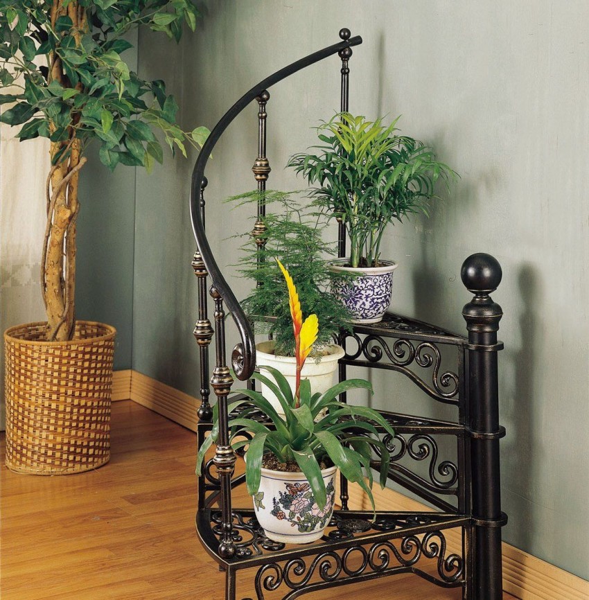 Другой популярный материал – металл. Его преимущество в прочности и долговечности, а также широких возможностях для творческих идей. На одной металлической стойке можно расположить более 10 вазонов для цветов. Особенно изысканно смотрятся кованые подставки. Их форма и стиль бывают самыми необычными.