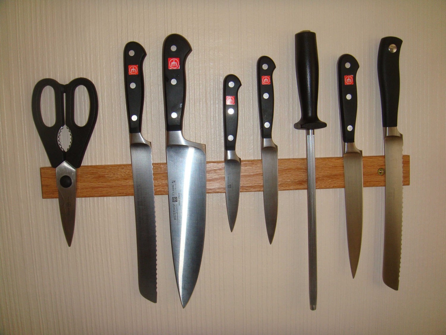учитывайте ширину планки, в соответствии с длинами лезвий вашего ножевого набора. Попадающая рукоять на магнитную полосу – не позволит клинку нормально на ней закрепиться;