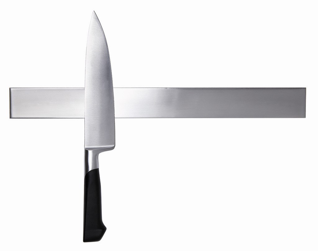Оригинальность держателя — великолепна. Производя монтаж магнитной планки, следуйте инструкции, не располагайте её на движущихся поверхностях. К делу следует отнестись серьёзно – нож на кухне самый опасный предмет.