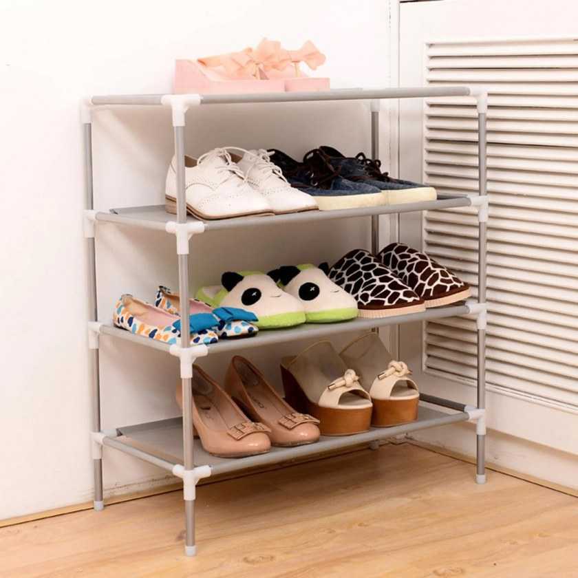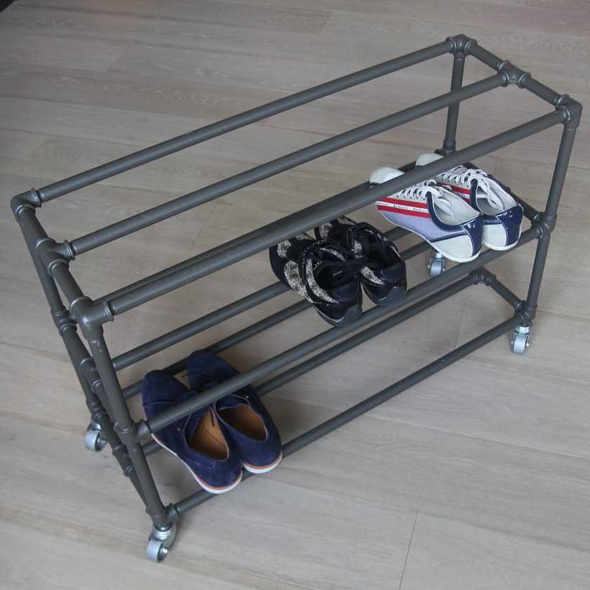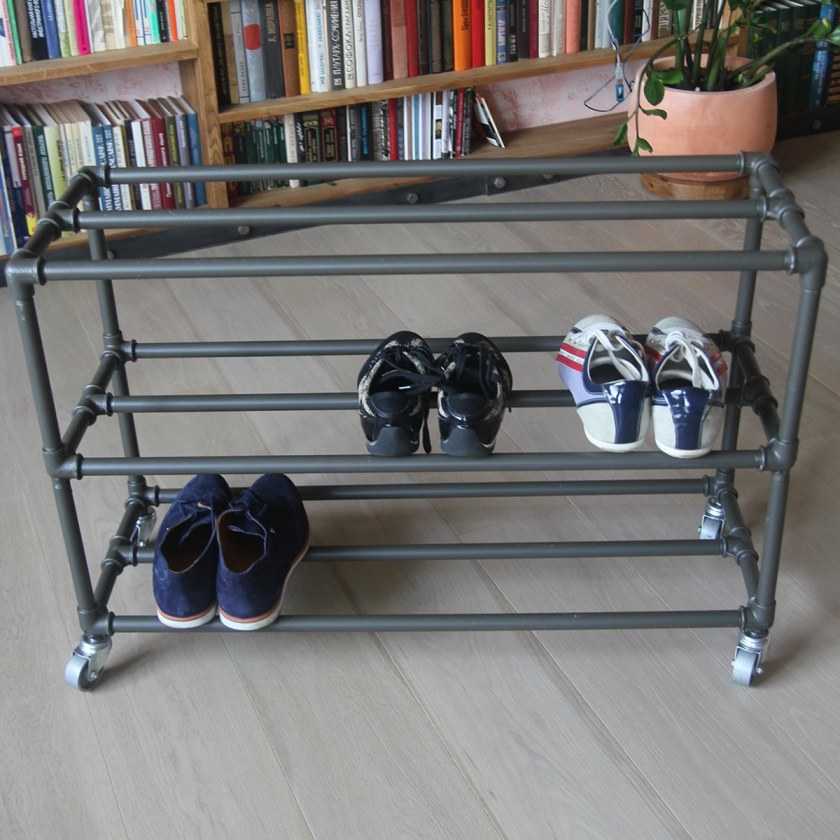 Полки для обуви легко соорудить своими руками из коробок, картона, медных труб, поддонов, металла, дерева. Существуют напольные, подвесные конструкции, стеллажи.