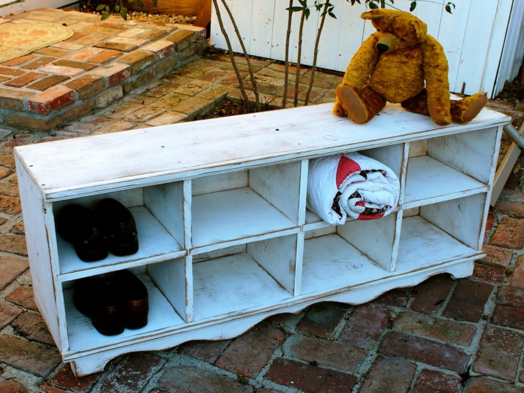 Элементы склеиваются между собой, окрашиваются и устанавливаются в прихожей. Не менее интересной будет идея создания обувницы из старых досок для скейта. Если вам в наследство досталась старая скамья, почему бы не использовать её для в качестве тумбы с сиденьем.