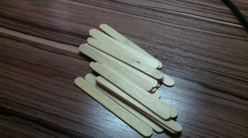 Шаг 1. Склеить палочки для еды. Склеиваются палочки для еды в желаемую форму посредством древесного клея. Можно начать с U-образной формы. Понадобится 13 палочек для еды. 6 палочек с каждой стороны, всего 12. Затем последняя палочка разрезается на мелкие кусочки. Требуется склеить их на дне двух склеенных палочек для еды с 6 частями. Требуется убедиться, что телефон может проскользнуть в подставку U-образной формы.