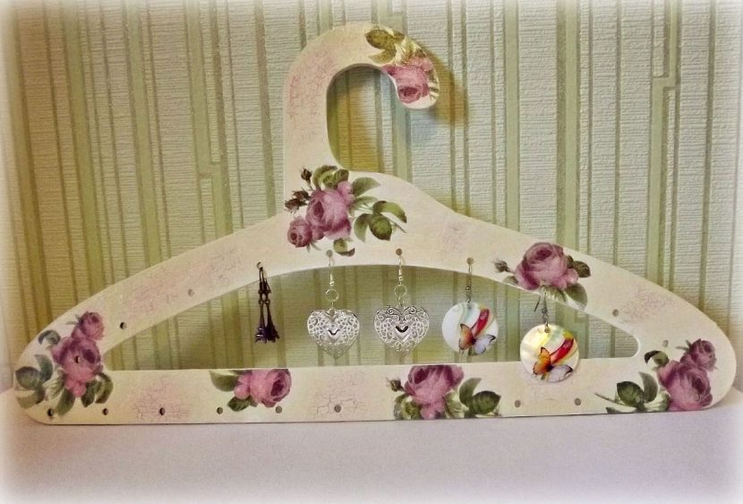 Для этого в деревянную поверхность плечиков вкручиваются дополнительные крючки, на которые можно развесить серьги или браслеты. На продольно полочке можно удобно расположить бусы и колье. Держатель можно украсить по своему вкусу, например в технике декупаж или расписать узорами вручную.