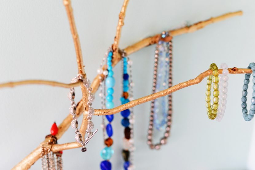 Это самый простой и очевидный вариант, для которого нужно лишь выбрать подходящую крепкую веточку и подставку под неё, или же просто прибить ветку на стену и развесить на ней свою бижутерию.