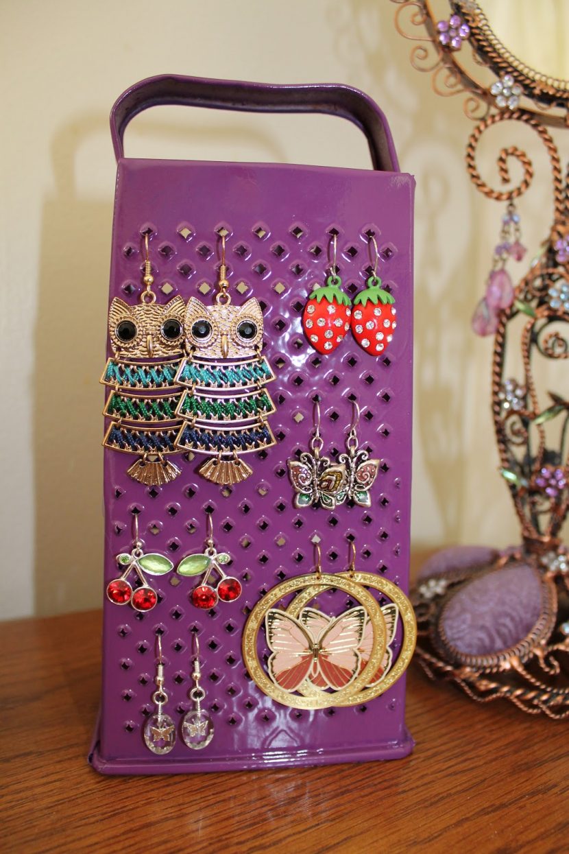 Если есть в доме ненужная терка, не спешите ее выбрасывать. Устойчивая конструкция, отверстия по периметру, — все это как будто создано для того, чтобы модницы-красавицы хранили свои сережки, вставляя в отверстия тонкие замочки.