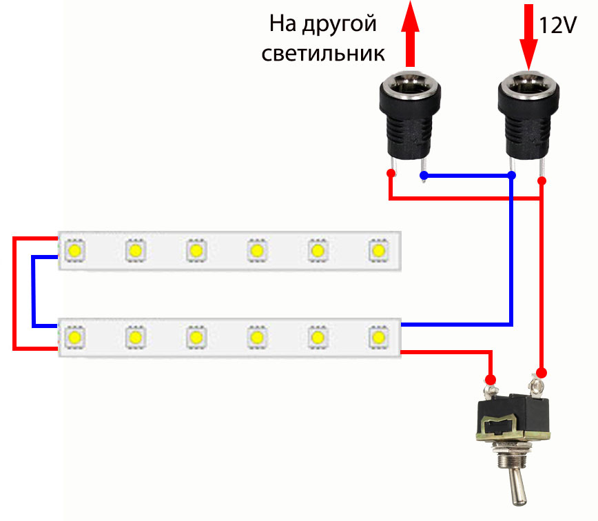 предварительно припаиваются два провода питания со штекерным разъемом и два