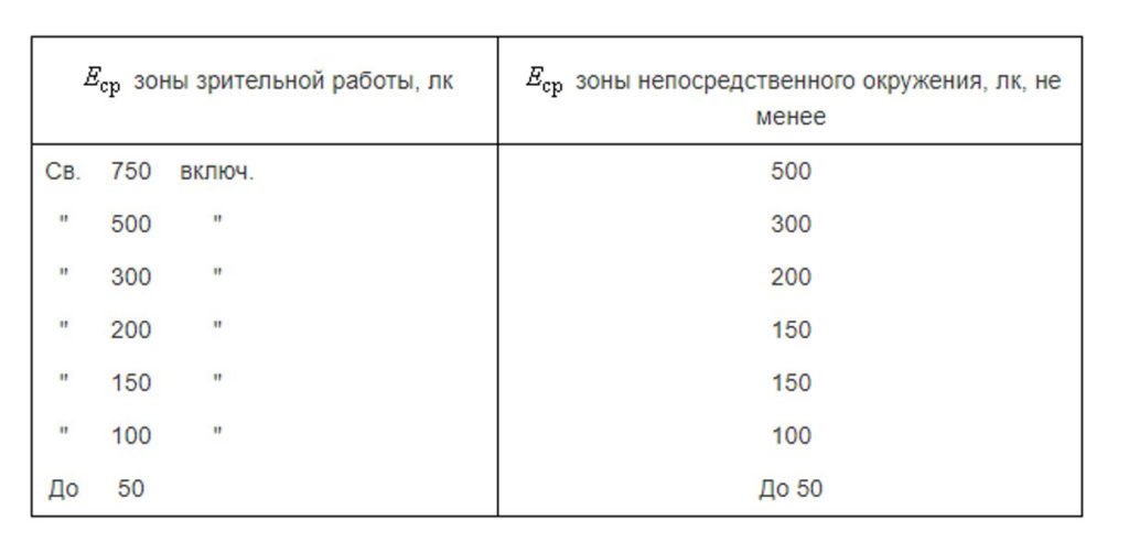далее 0,5м от рабочего места — это периферийная зона. В ней освещенность должна