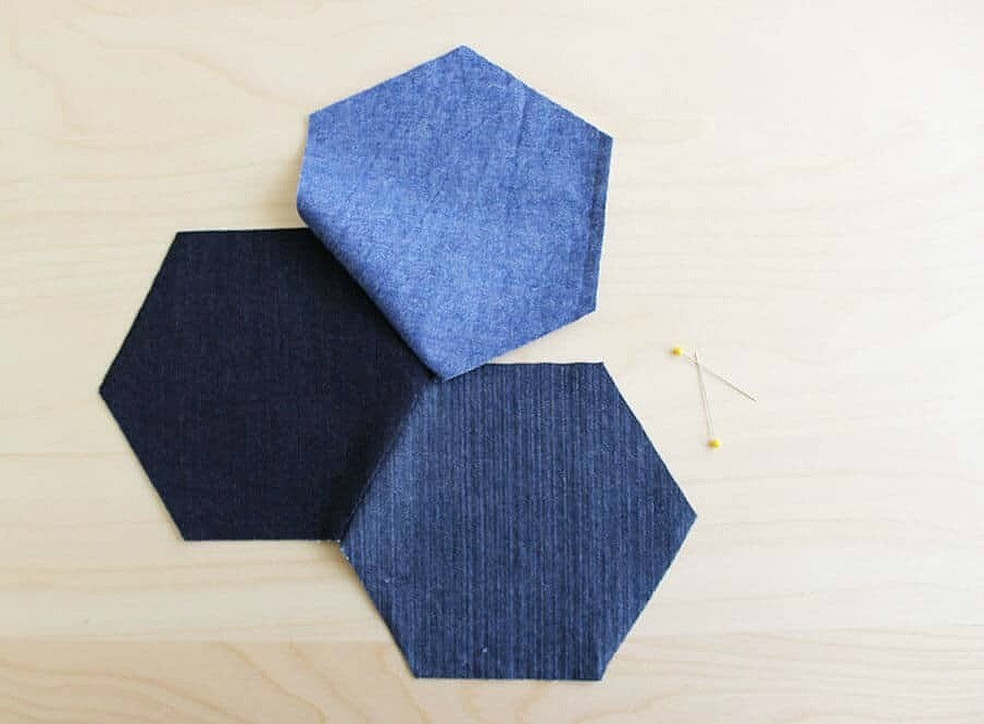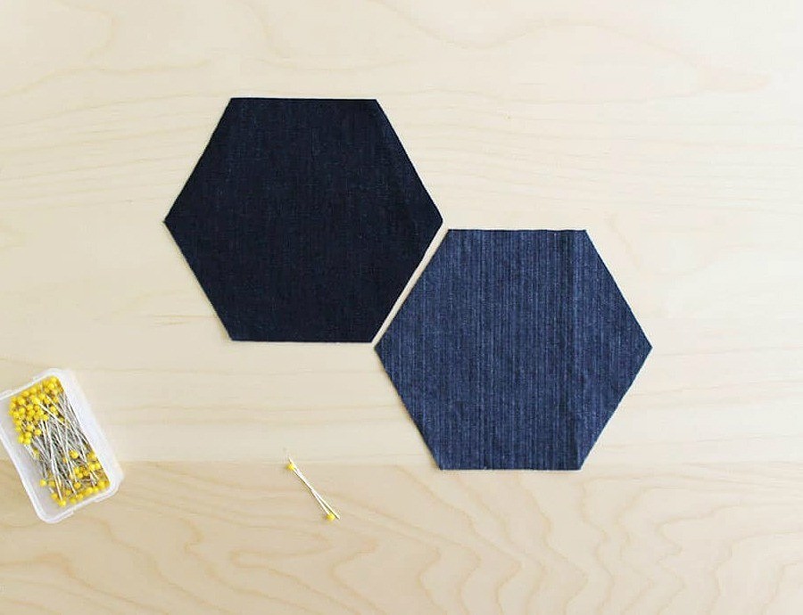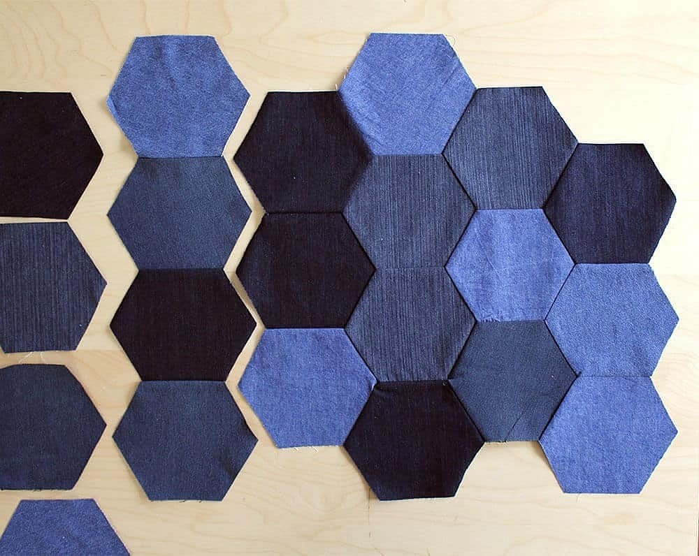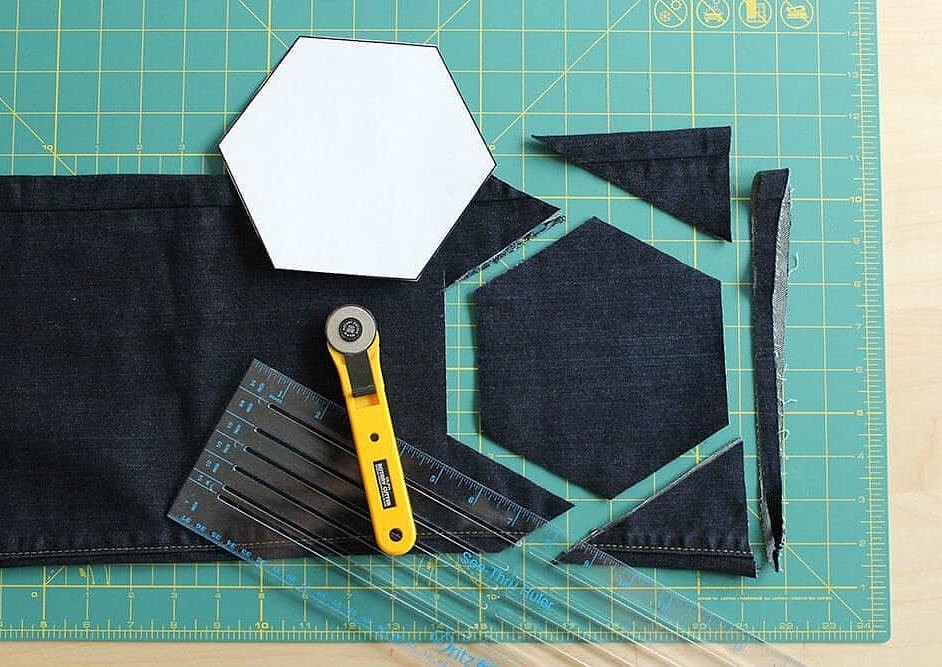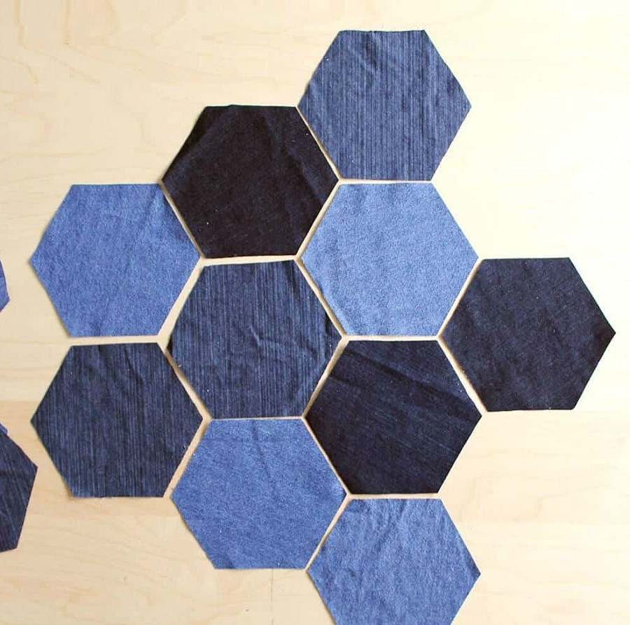 Готовим штук 30 шестиугольников — вырезаем их из старых джинсов разных оттенков.