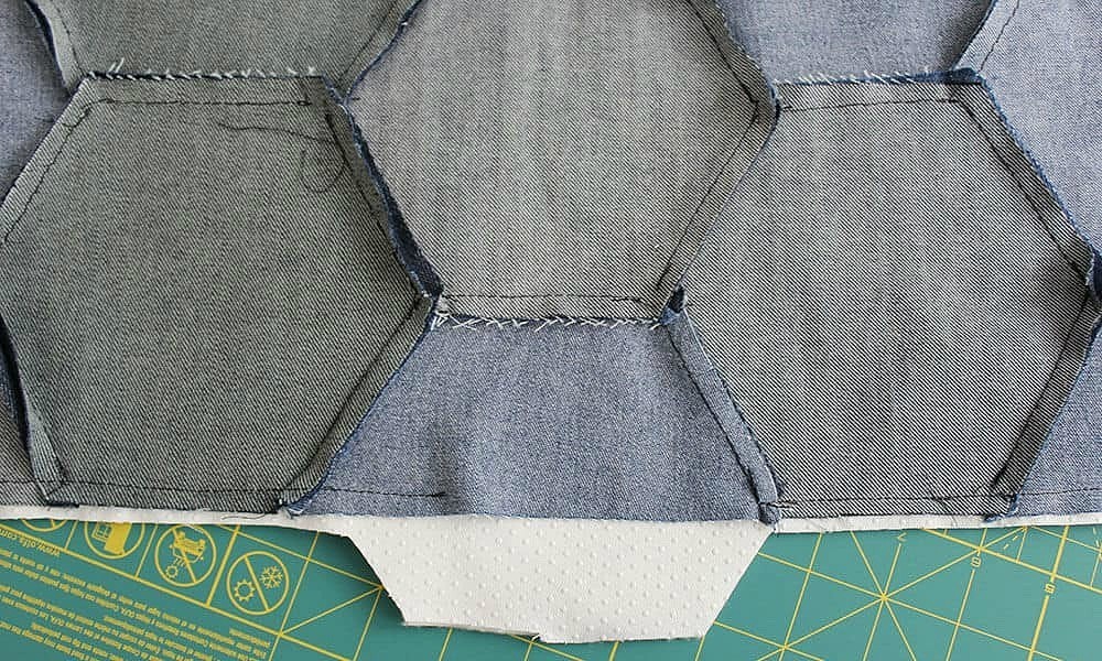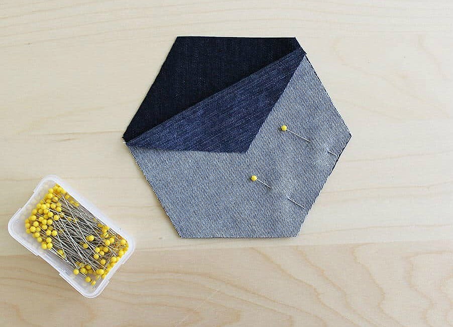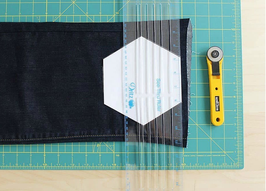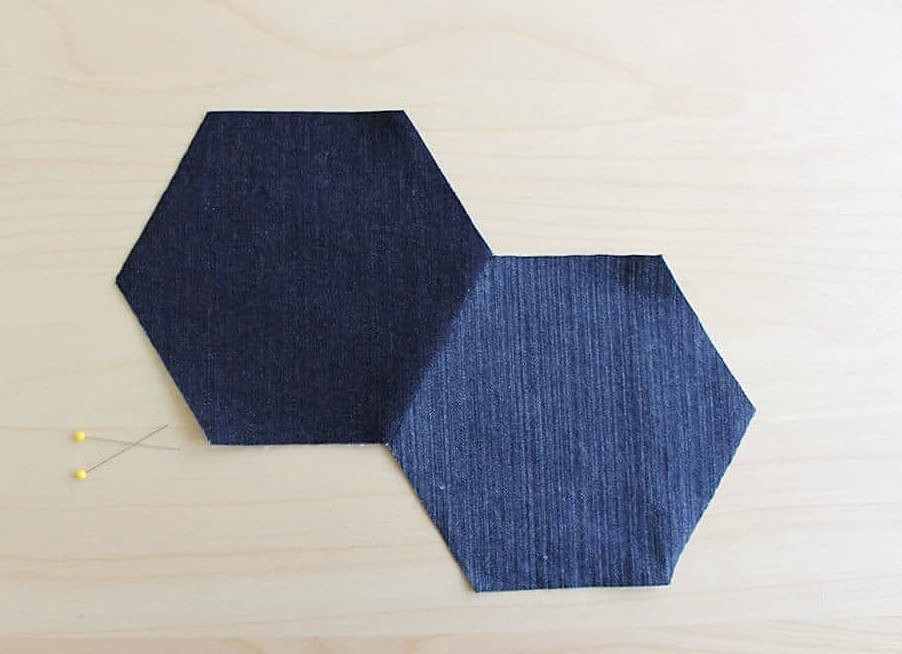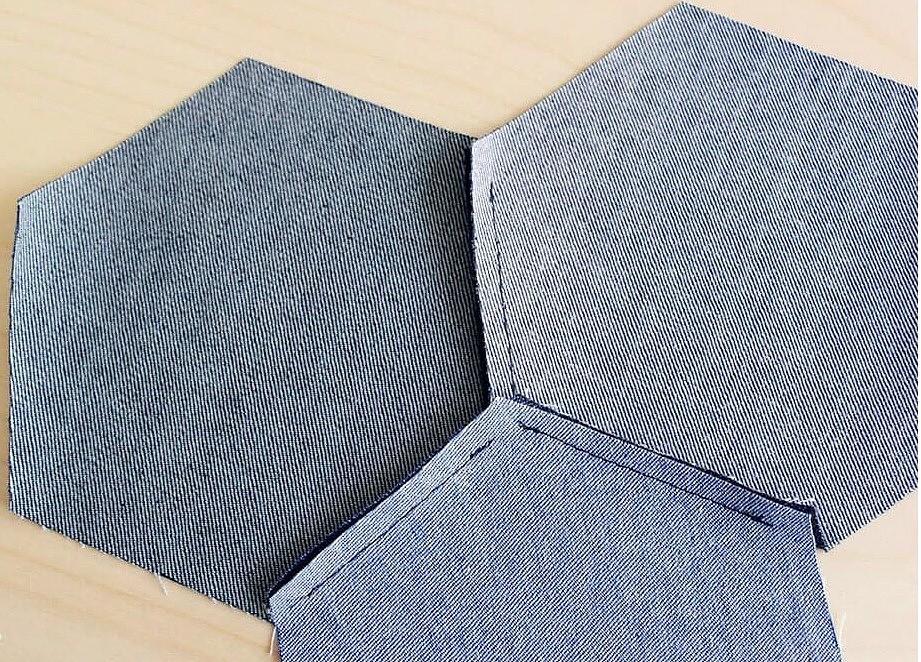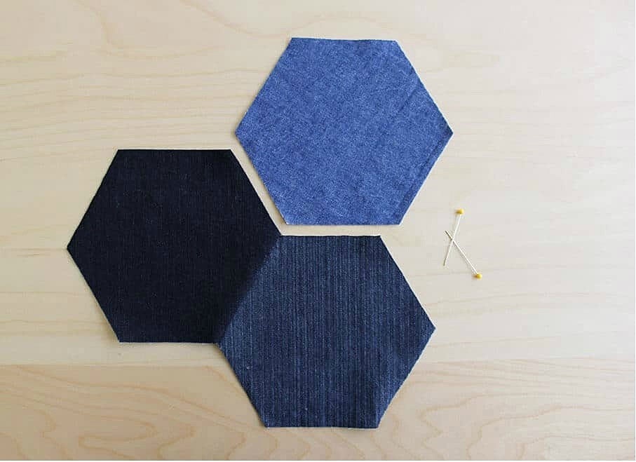 Готовим штук 30 шестиугольников — вырезаем их из старых джинсов разных оттенков.