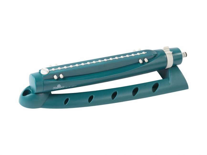 Дождеватель для полива растений – устройство, помогающее справиться с уходом за растениями в теплое время года. RACO 4260-55 / 691 – хороший вариант для колеблющегося оросителя. Аппарат рассчитан на прямоугольную зону, так как имеет 18 форсунок. Установка происходит на прилагаемой подставке.