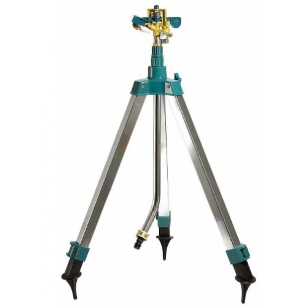 Профессиональный круговой дождеватель для секторного полива площадью 500 квадратных метров. Устанавливается на штатив, ножки которого снабжены шипами для надежной фиксации в земле. Изготовлен из коррозионно-стойкого алюминиевого сплава для длительного срока службы. Насадка диаметром 3,5 метра изготовлена из латуни и очень точная. Во время работы жиклер не отклоняется от сильного ветра.