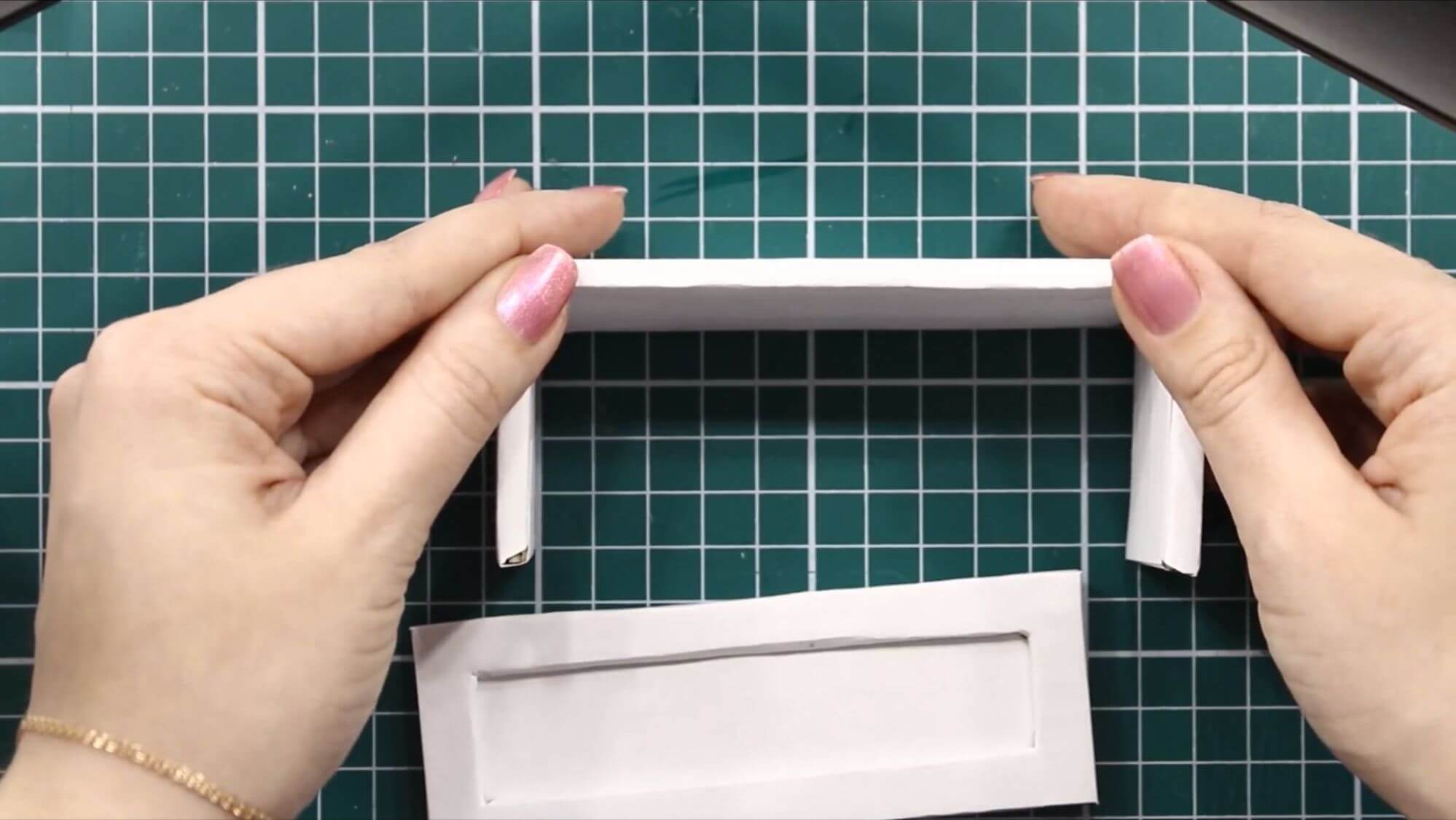 Поместите сверху вторую деталь стола, так же приклейте ее. Сбоку приклейте полоски картона и самоклеющуюся бумагу.