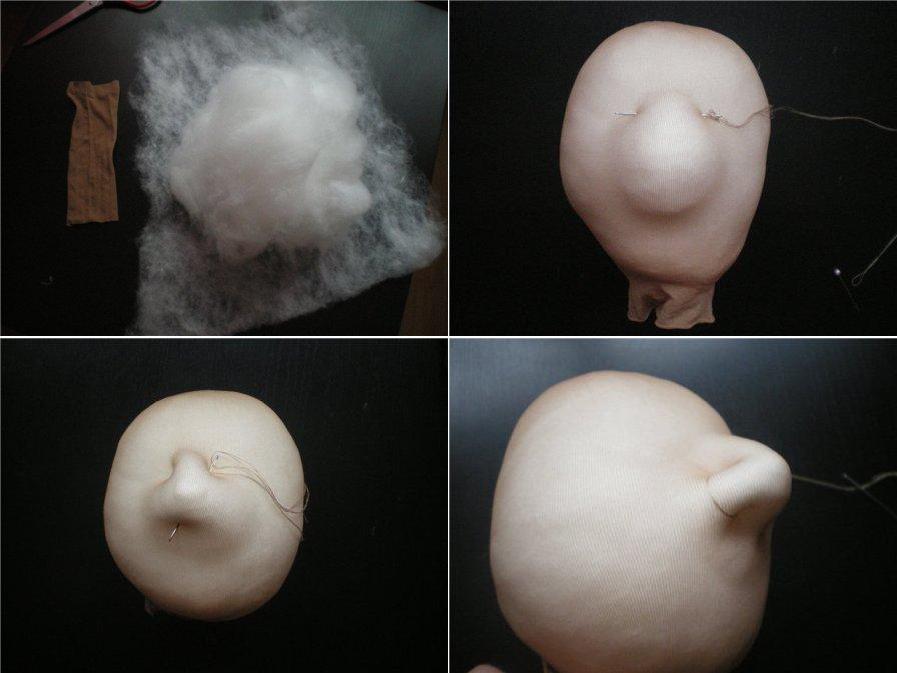 Чтобы создать голову возьмем носочную часть капроновых колготок. Сплющив определенное количество синтепона, его закладываем внутрь. Затем, дополнительную порцию, скатанную в шарик небольших размеров, крепим в центре того материала, которым наполнена часть колготок. Особенно необходимо поработать над носом, если вы не хотите видеть его картошкой. Для этого он вытягивается и закрепляется с помощью длинной иголки. Таким же образом создаются и складки на коже, а также щеки.